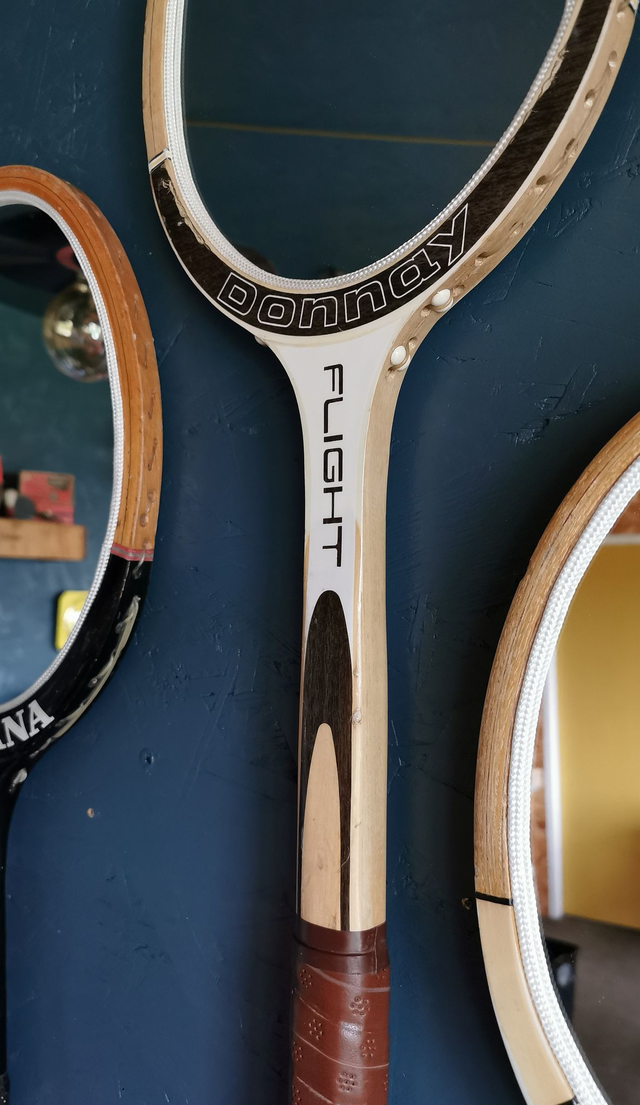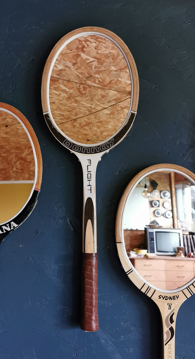 Chinées une par une en brocantes, recycleries et vide greniers, voici une série de raquettes de tennis en bois des années 50 aux années 80 détournées en miroirs uniques et originaux !