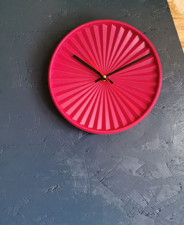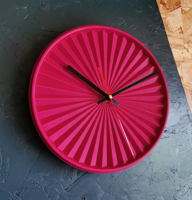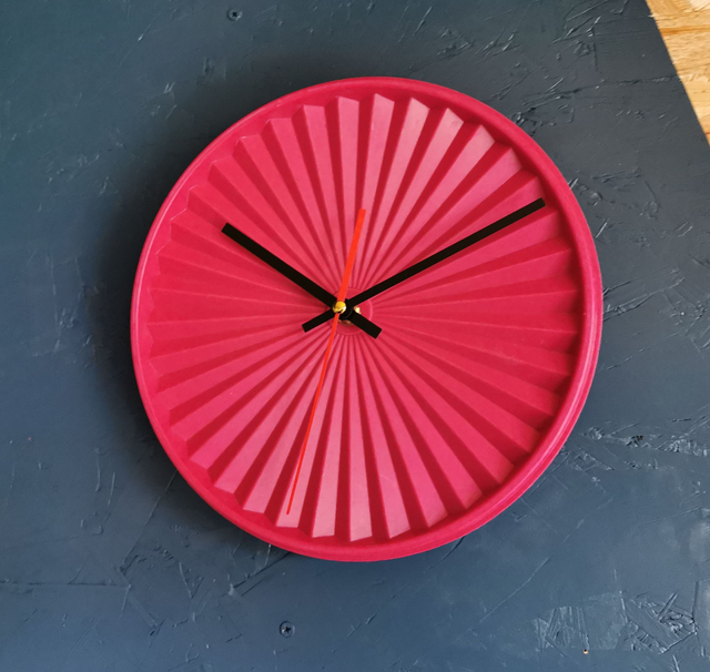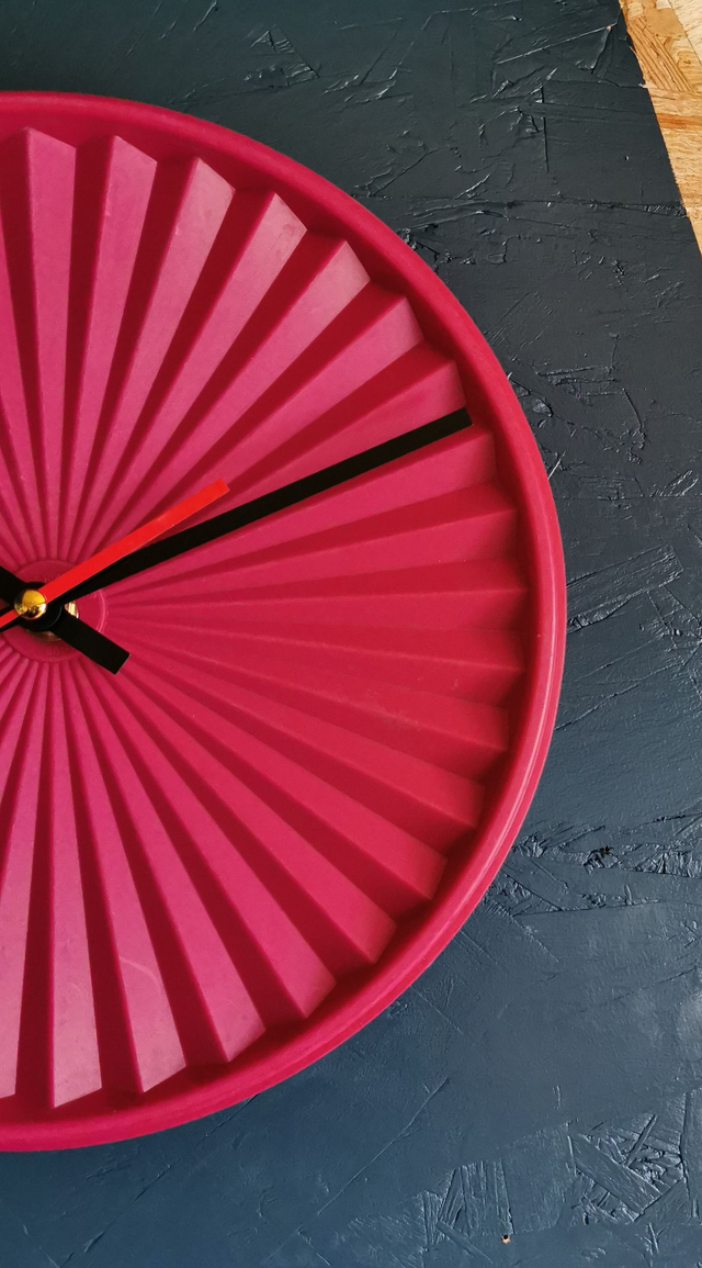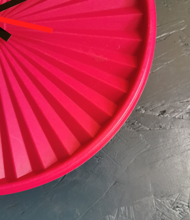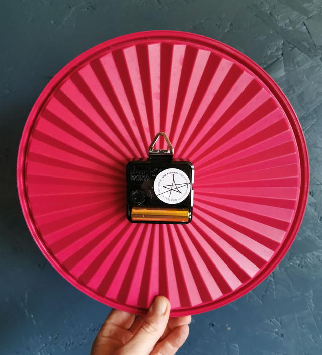 Horloge pendule murale vintage silencieuse ronde Tupperware Soleil "Fushia"